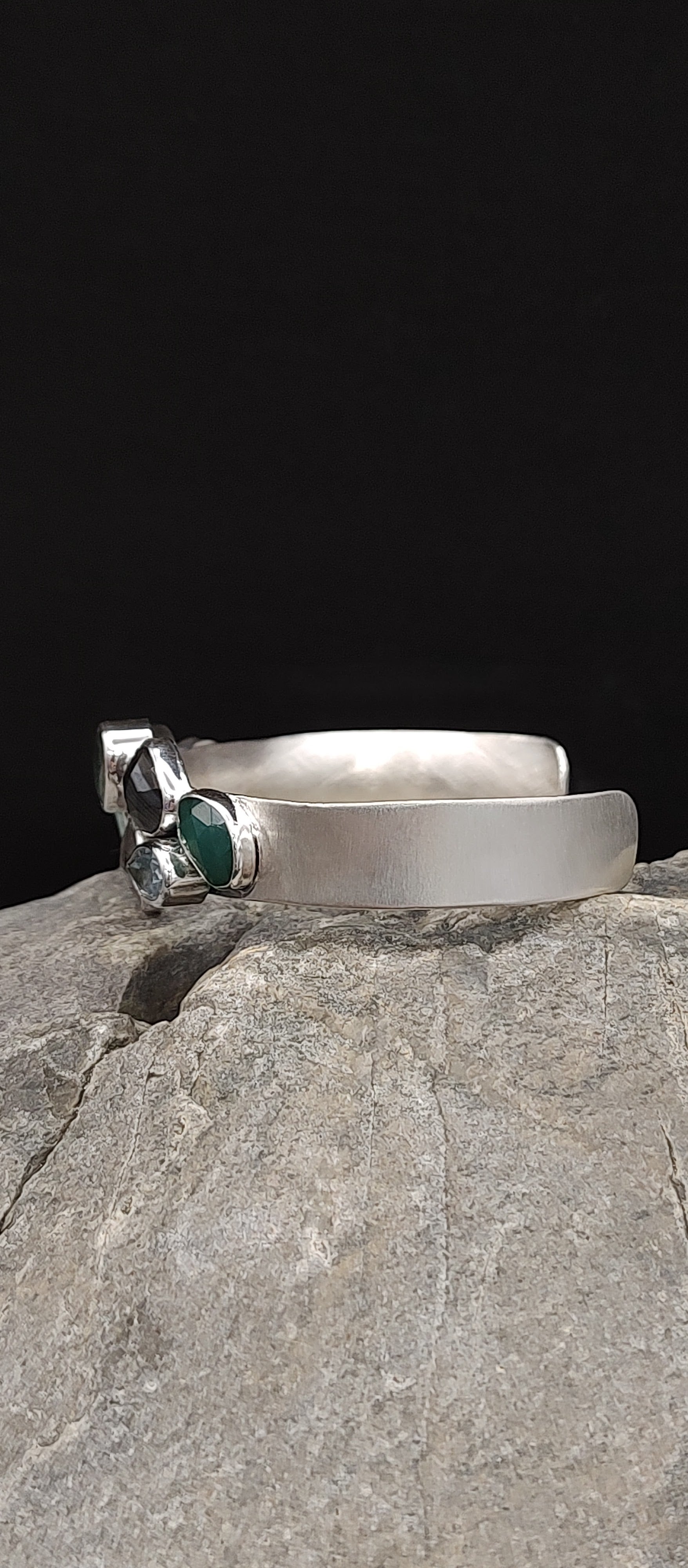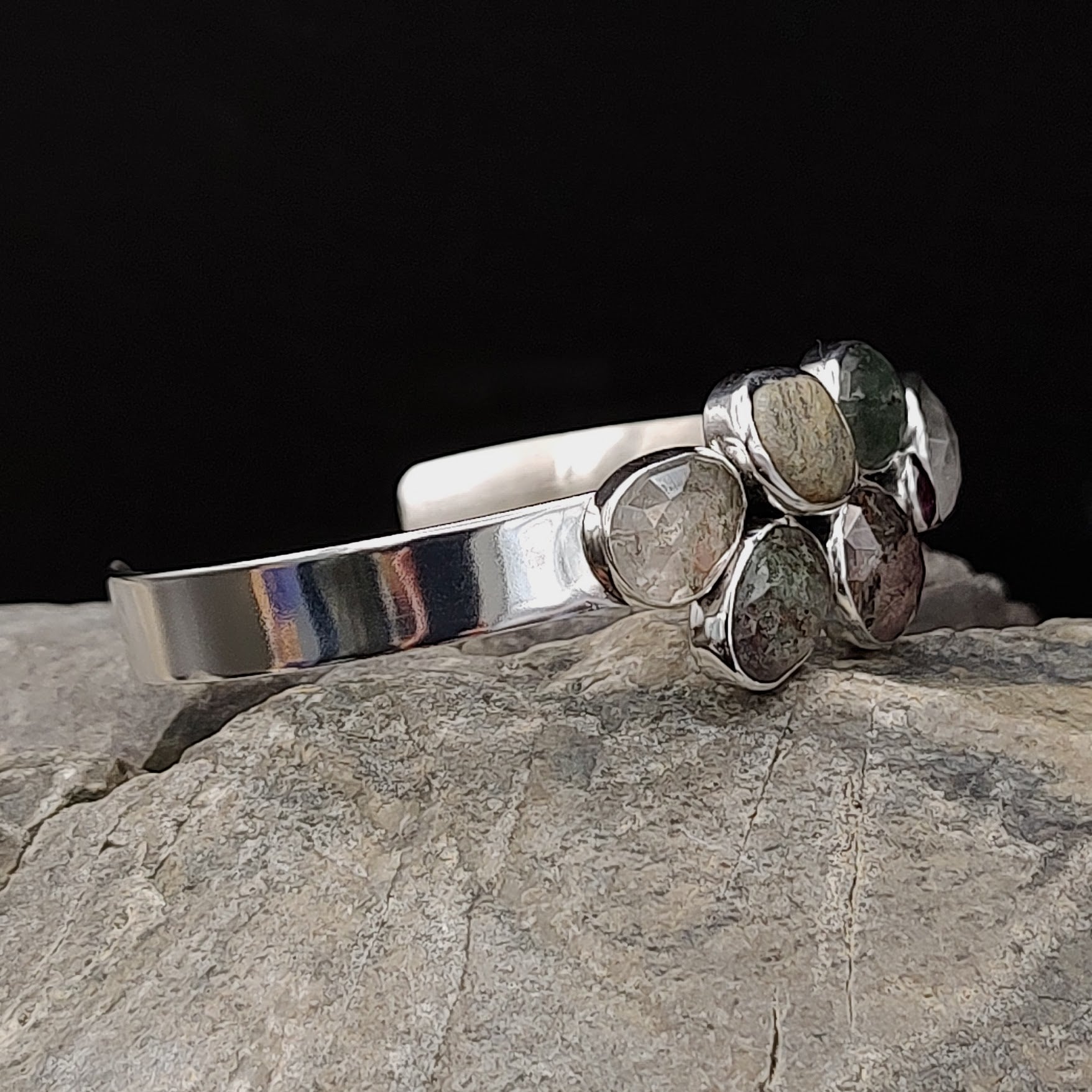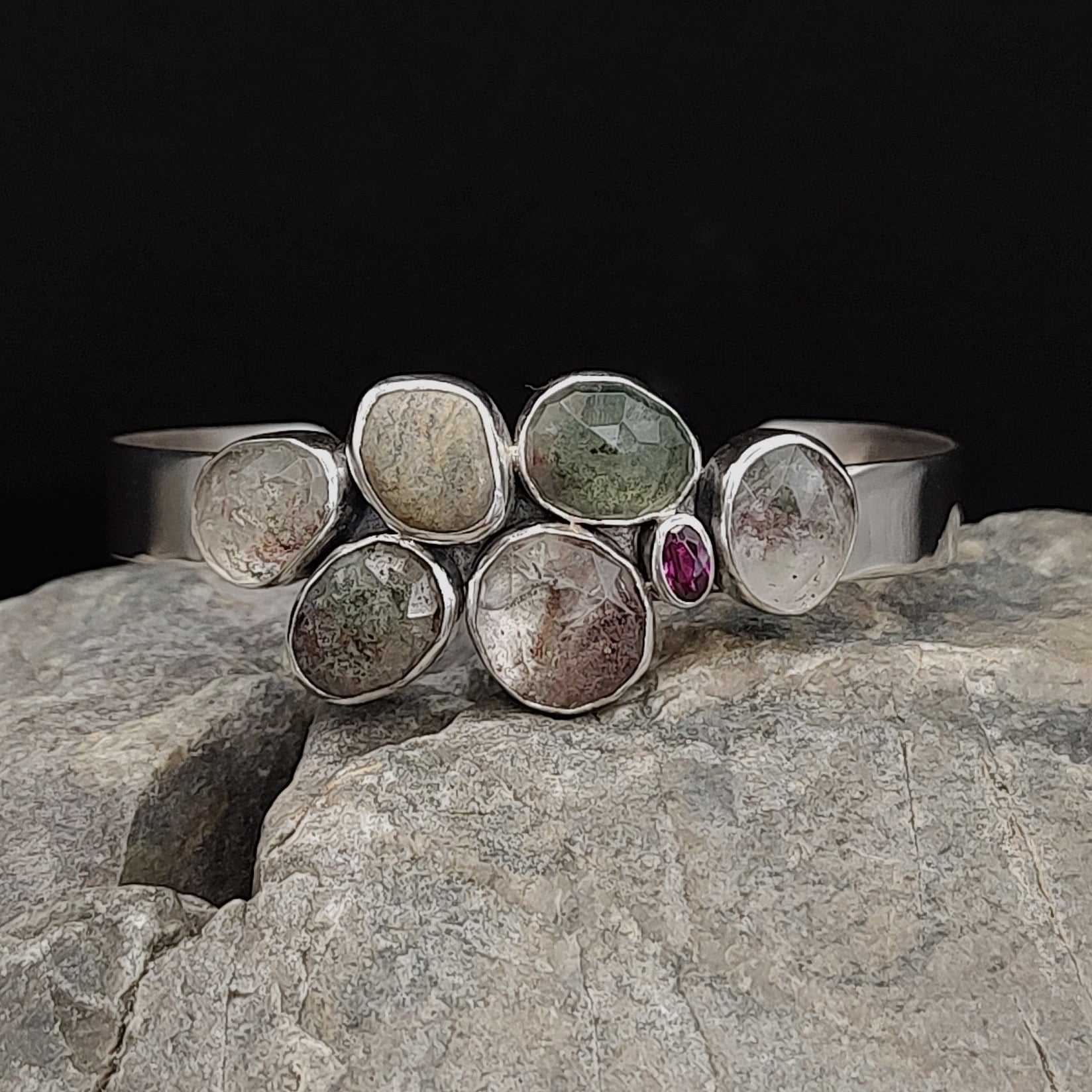 Cuff bracelet- rose cut garden quartz, faceted oval (3mmx5mm) rhodolite garnet