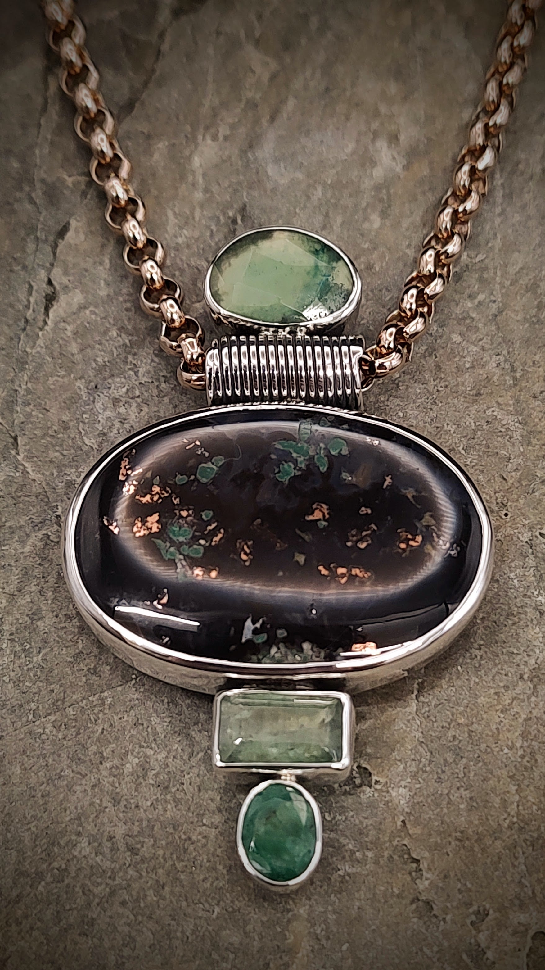 One-of-a-kind pendant with chain- copper in chalcedony, rose cut gem silica, faceted green kyanite, faceted emerald